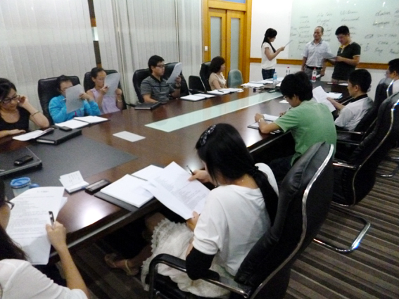 經過兩周的精心籌備,第一期英語培訓活動于6月26日晚上7點至9點成功舉行。國際部全體同事參與了整個培訓的所有環節,公司領導蒞臨旁聽,作為對本次活動的支持。首先,所有學員都介紹了自己的英文名,以便以后的英語交流;隨后,國際部的講師們對常用的幾個英語情景對話進行了講解,并親自示范情景對話,學員們也自由組合演繹口語對話,整個課堂氣氛活躍,歡笑聲陣陣。